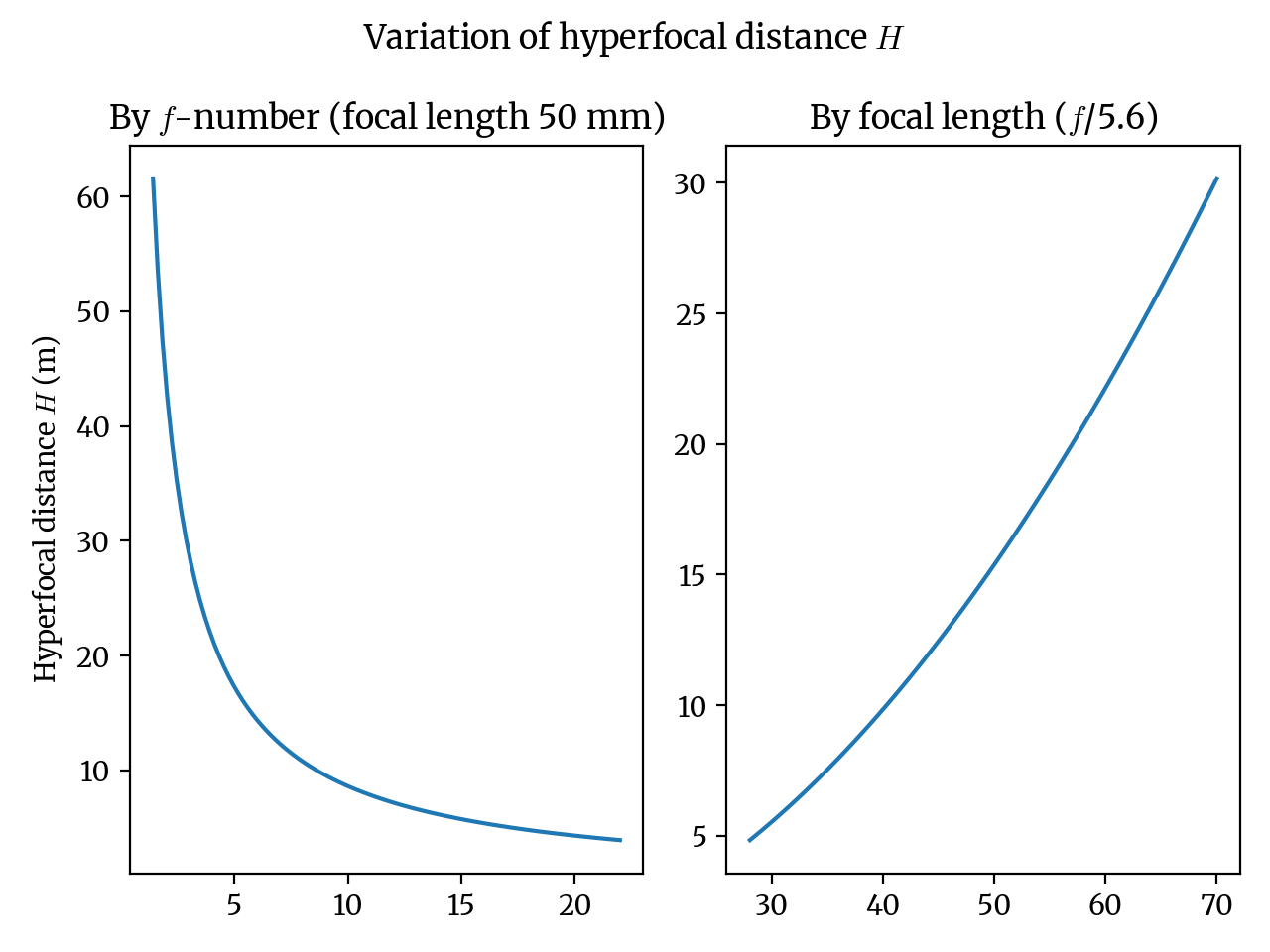 For a focal length of 50 mm, an f-number of 8, and C as 0.029, the hyperfocal distance is about 10.77m. What this means is that for these camera settings, if you focus on a subject 10.77 m away, the depth of field will stretch behind the subject all the way to the horizon. The equation also shows how focal length and f-number affect the hyperfocal distance.