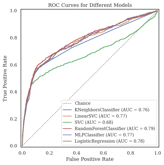 To predict outcomes, I selected six common ML models as candidates for testing. I selected the -Nearest-Neighbors (KNN), Linear SVM, standardd SVM, and Logistic Regression (LR) classifiers. I also included a Random Forest (RF) classifier and an MLP classifier, which is a popular type of neural network. The first four models are distance-based models, meaning they work by calculating the distance between points in the data. RF is a tree-based method, meaning it creates a group of randomly chosen decision trees and averages them together to make predictions. RF is one of the most common non-distance-based classifiers.